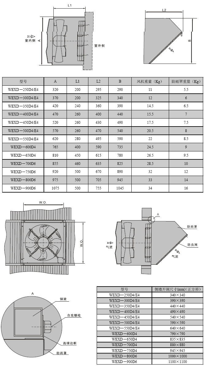 DWEX边墙风机又叫WEX边墙风机,其采用先进的前掠型叶片、低噪音的外转子或内转子风机专用电机直联传动,方形外壳设计可以方便地安装在混凝土墙、砖墙或轻钢压型墙板上,方形防雨罩结构牢固,外形美观。具有噪声低、风量大、运行可靠、性能参数范围广、安装简便等特点。根据输送介质的要求,可制成防腐、防爆型。 DWEX(WEX)系列风机一般用于边墙壁式排风,配设45°防雨罩(或特殊制造成60°)和防虫网(夜间可防止昆虫循灯光飞入车间)。可按需要制成边墙送风机型号为DWSP(WSP),配设90°防雨罩(防风、雨、尘)和防虫网(夜间可防止昆虫循灯光飞入车间)。